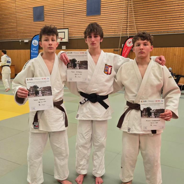 Bis 55 kg ließ Fynn Evers keinen Zweifel an seiner herausragenden Form: Mit souveränen Kämpfen marschierte er durch das Teilnehmerfeld und sicherte sich verdient den Titel des Norddeutschen Meisters. Fabian Drews komplettierte das starke Ergebnis mit Bronze. In der Klasse bis 60 kg wurde Leon Hoppe für seine Leistung mit Rang drei belohnt. Im schleswig-holsteinischen Duell um Platz drei setzte sich Boris Shuster gegen Caspar Warnecke durch und qualifizierte sich damit ebenfalls für die DEM in Leipzig.