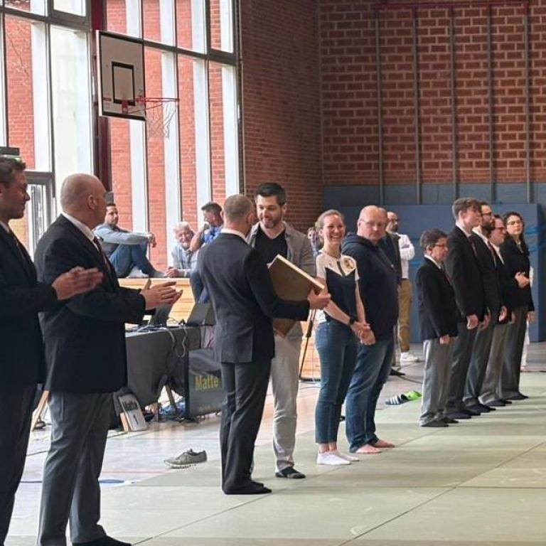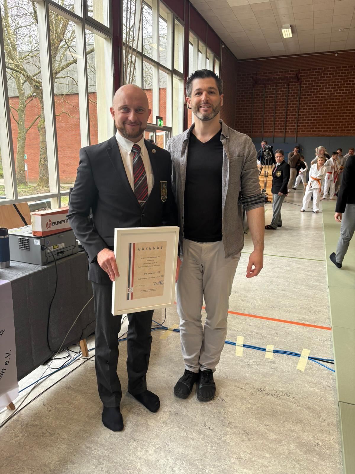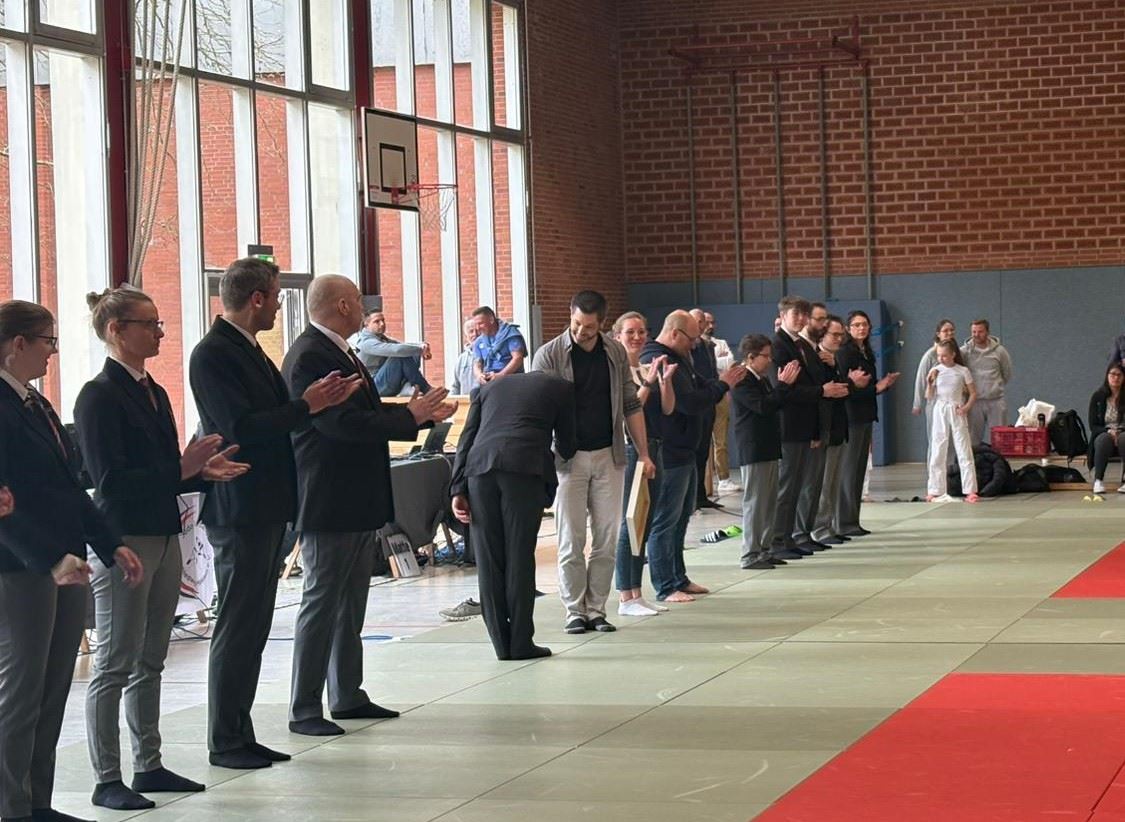 Am 18. April nutzte unser Vizepräsident Janek Brütt die Bezirkseinzelmeisterschaft Süd der U11 und U13, um unseren Bezirks-Kampfrichterobmann, Erik Schefer, die goldene Ehrennadel des Judo-Verbands Schleswig-Holstein überreichen zu dürfen. Der Verband möchte Erik für seine langjährige Tätigkeit als Kampfrichter, für sein Engagement im Bezirk, aber auch auf Landes- sowie auf Bundesebene, ehren. Ebenfalls dankt der Landesverband ihm für seine Mühen in der Kampfrichter-Ausbildung sowie für das Installieren und und Einführen des Care-Systems für die Kampfrichter.