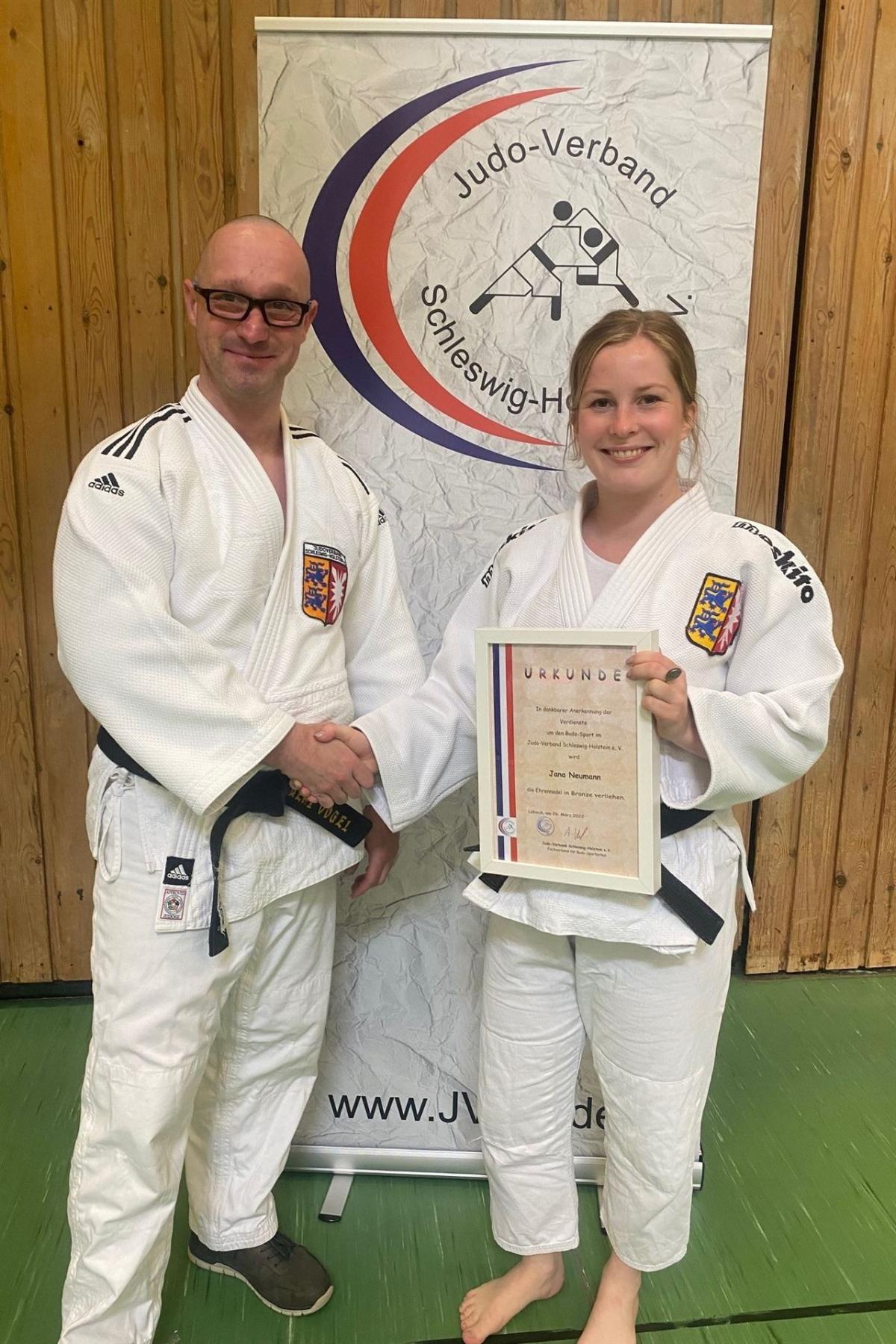 Schweren Herzens verabschieden wir unsere Landestrainerin des Talentpools, Jana Neumann, aus ihrem Amt. Als Dank und in Anerkennung ihres Einsatzes für den Talentpool überreicht Andreas Vogel, Präsident des JVSH, die Ehrennadel des Judoverbandes Schleswig-Holsteins in Bronze.