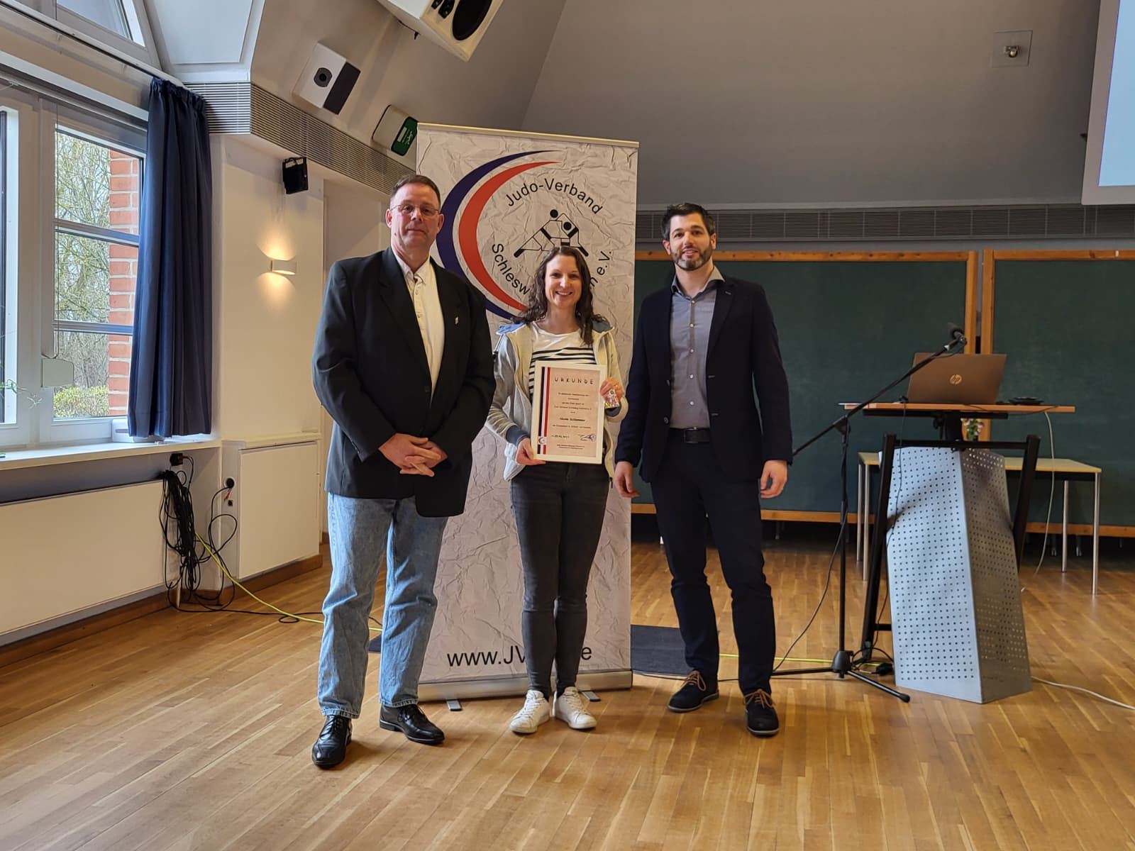 Am Anfang der Mitgliederversammlung stand eine Schweigeminute für Andreas Neumann, der am 19.10.2025 verstorben ist. Auch in diesem Jahr durften im Rahmen der Mitgliederversammlung zwei Judoka eine Ehrung entgegennehmen: Patrick Kuberski erhielt die Ehrennadel in Bronze und Nicole Schlemmer die Ehrennadel in Silber. Im Anschluss wurden zwei neue Ehrenmitglieder von der Versammlung gewählt: Sabine Zboralski und Alexander Schulan.