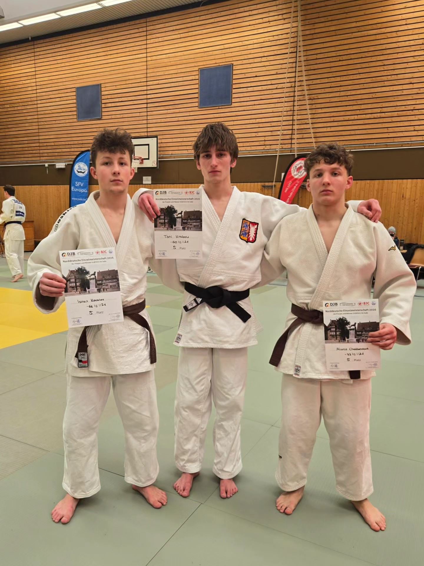Bis 55 kg ließ Fynn Evers keinen Zweifel an seiner herausragenden Form: Mit souveränen Kämpfen marschierte er durch das Teilnehmerfeld und sicherte sich verdient den Titel des Norddeutschen Meisters. Fabian Drews komplettierte das starke Ergebnis mit Bronze. In der Klasse bis 60 kg wurde Leon Hoppe für seine Leistung mit Rang drei belohnt. Im schleswig-holsteinischen Duell um Platz drei setzte sich Boris Shuster gegen Caspar Warnecke durch und qualifizierte sich damit ebenfalls für die DEM in Leipzig.